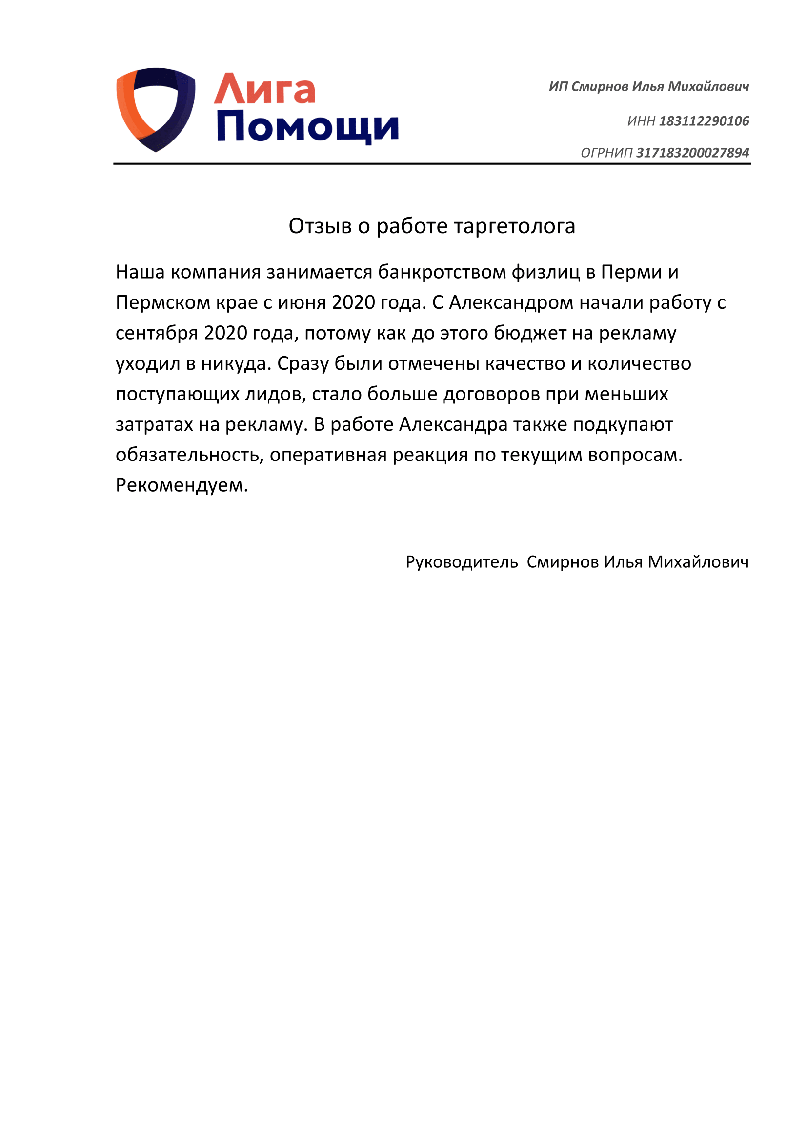 года работаем в нише, как маркетологи. А до этого лично были менеджерами по продажам услуг банкротства в федеральной компании. Знаем кто ваша целевая аудитория, чего она хочет и чего боится. Знаем на что и как реагирует целевая аудитория и как добиться от нее заявки. Глубоко прорабатываем все наши стратегии лидогенерации.
